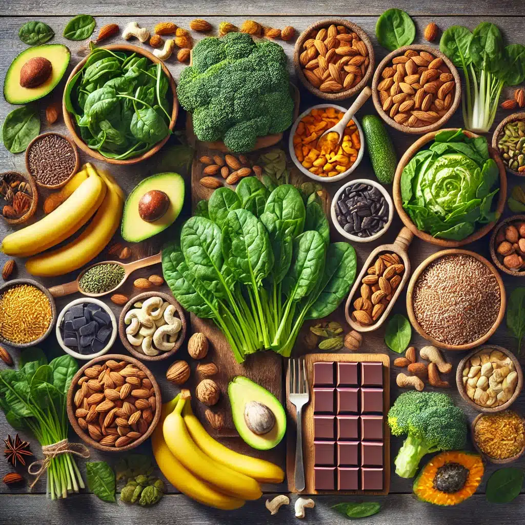 Found in spinach, kale, nuts, seeds, quinoa, legumes, and dark chocolate.